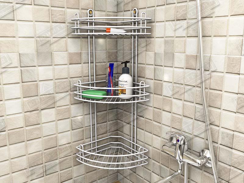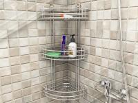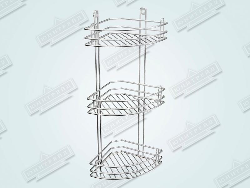 Металлическая навесная угловая полка в ванную комнату сделана из проволки. Состоит из 3-х ярусов. Предназначена для хранения шампуней и других мелочей. Крепится на саморезы (идут в комплекте).