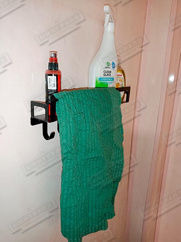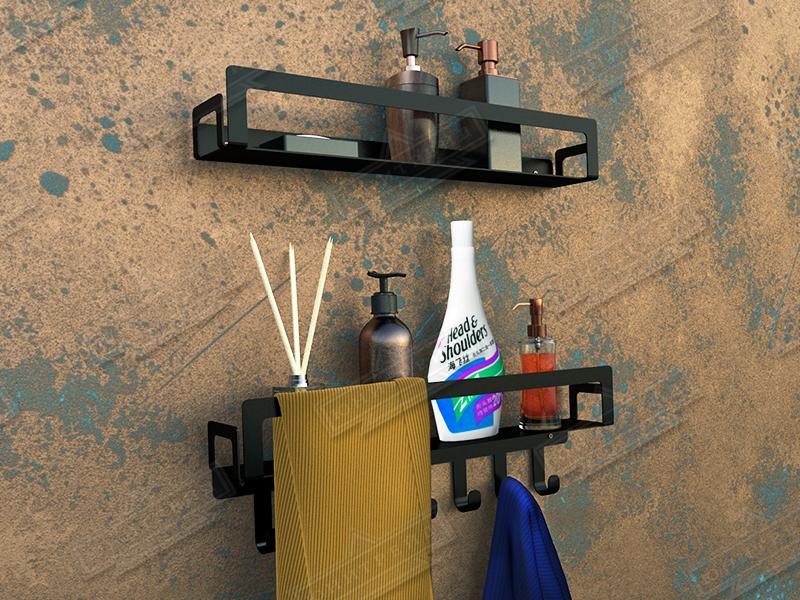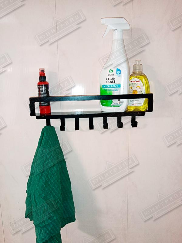 Металлические настенные прямые полки для ванной комнаты сделана из листового металла. Состоит из 2х полок, которые могут регулироваться по высоте и крепиться к стене на саморезы (идут в комплекте). Нижняя полка имеет7 крючков для мелочей и бортик в передней части полки может служить полотенцедержателем. Верхняя полка также имеет полотенцесушитель. Полки больше всего подходят под стиль лофт и минимализм в интерьере, предназначены для хранения шампуней полотенец, аромасвечи, аромамасла, мыла, крема и т.п.