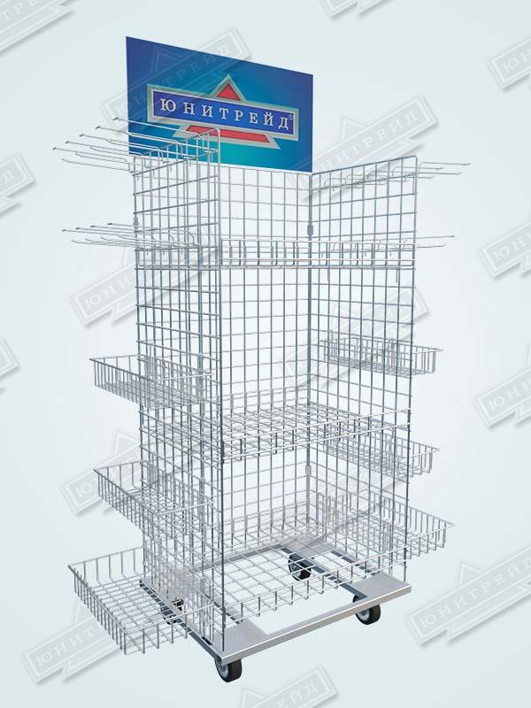 Главная / Продукция / Торговое оборудование / Оборудование для торгового зала (стенды /стойки/стеллажи) / Сетчатый торговый стеллаж конструктор разборный на колесах